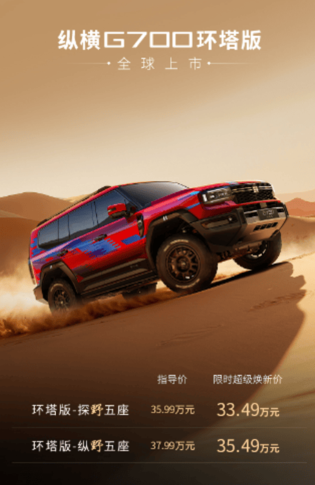 作为本次发布会的中心车型,纵横G700环塔版的定价与权益设置直接触及顾客关心。新车共推出2个版型,限时超级焕新价定格在33.49万元至35.49万元区间,一起配套九重上市专属购车权益,掩盖购车、用车、玩车全环节,构成完好的服务保证体系。从置换补助到金融方案,从质保方针到专属体会,权益内容统筹实用性与专属感,企图构建差异化的用户服务体会。